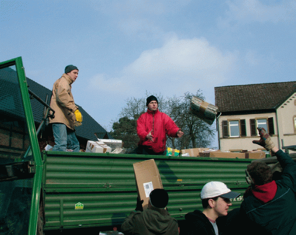 In der Praxis setzen wir dieses konkret bei den Altpapiersammlungen um. Gleichermaßen beteiligt sind Jugendliche und Erwachsene beim Treckerfahren, Autofahren oder beim Auf- und Abladen.