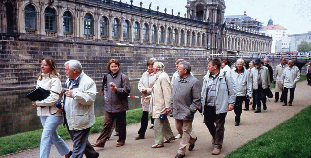Besonders große Anforderungen an den Reiseleiter und die Gruppendisziplin erforderte die Pfingstreise 1999, die mit der Bahn nach Dresden und dort überwiegend mit öffentlichen Verkehrsmitteln durchgeführt wurde. In Dresden angekommen, wurde das Gepäck im Bahnhof deponiert und das Programm begann mit einer Führung in der Semperoper. Danach Hotelbezug und anschließend zurück ins Zentrum "Dresden bei Nacht", wobei für einen Teil der Gruppe ein Opernbesuch "Capriccio" vorbereitet war. Für den 2. Tag war ein Bus arrangiert, der die Gruppe zunächst nach Meißen zur Porzellanmanufaktur brachte und danach den "Spuren der Gräfin Cosel" folgte mit Führungen in der Burg Stolpen und dem Schlosspark Pillnitz. Am Sonntag besuchte die Gruppe zunächst das Pontifikalamt in der Hofkirche, das vom Opernchor festlich gestaltet wurde. Gern erinnern sich viele an die eindrucksvolle Predigt des Bischofs. Danach folgte eine Stadtführung zu Fuß mit Besichtigung des Grünen Gewölbes. Am Abend besuchte wieder ein Teil der Gruppe die Semperoper "Don Giovanni". Bevor am nächsten Tag die Rückreise angetreten wurde, konnte jeder noch einmal einen Stadtrundgang nach eigenen Wünschen unternehmen.